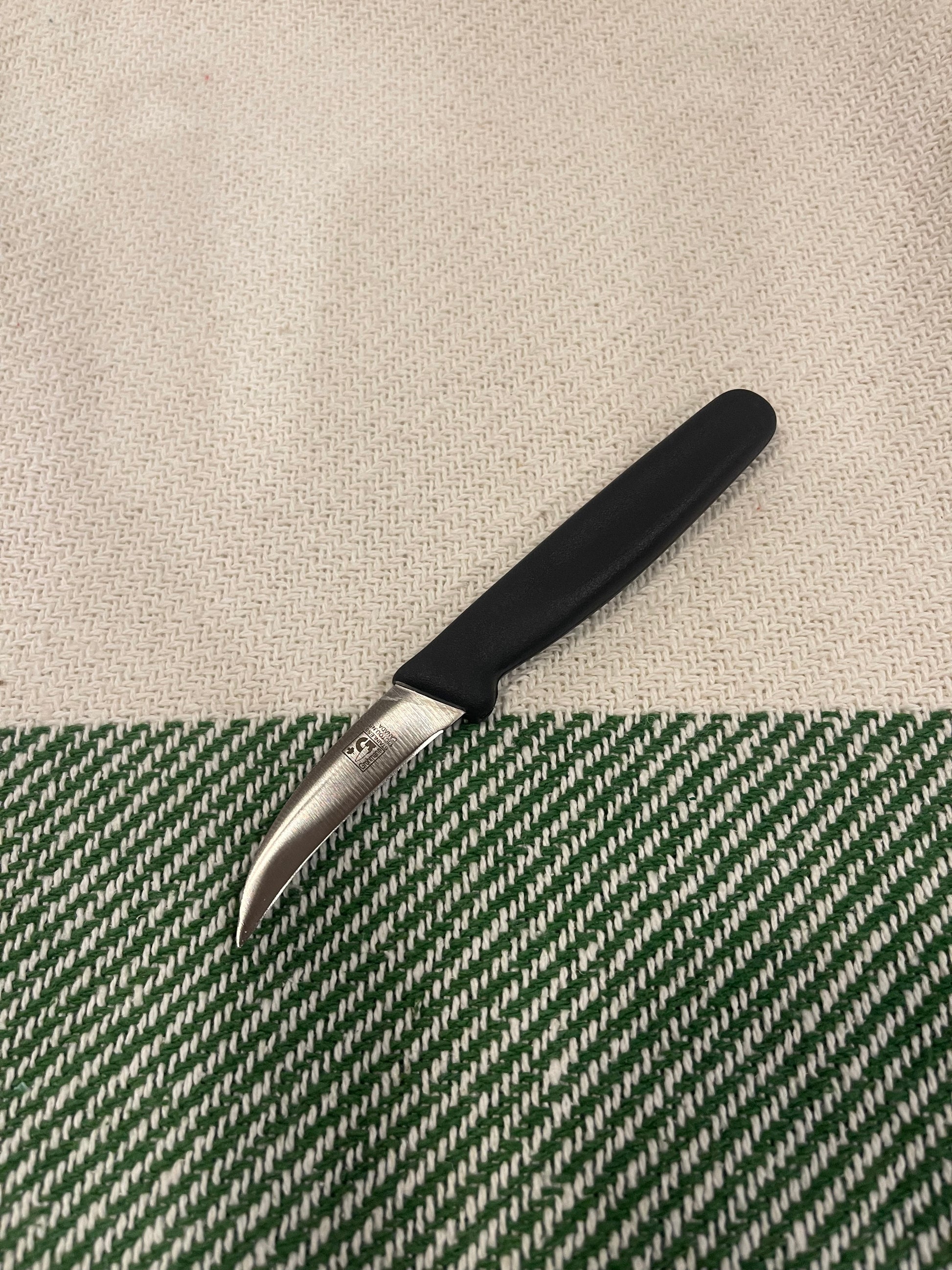 #201P-2 curved blade. Ideal for paring/peeling potatoes, apples and more, 28 grams. This is partial tang steel that goes partway through the handle. Black polypropylene nylon waterproof handles, so they can be sanitized
