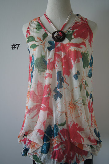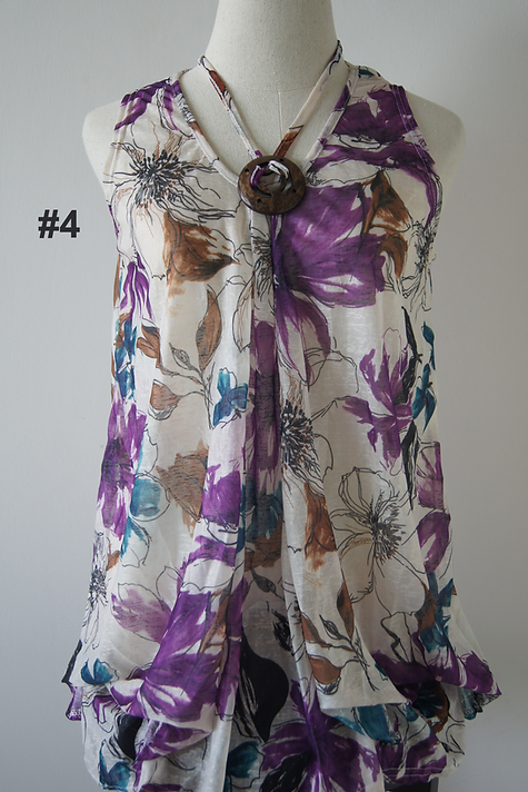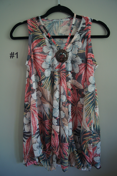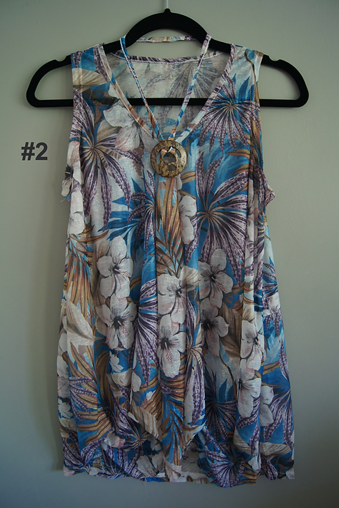Top with coconut necklace, this piece has a necklace built in so you don't need one which is very convenient, it is also very fun and elegant, this tunic style top could be worn with capri leggings or capri pants. The material is a breathable sheer polyester blend with a beautiful soft flower print. Size is one size fits up to 40" breast and is 28" long.